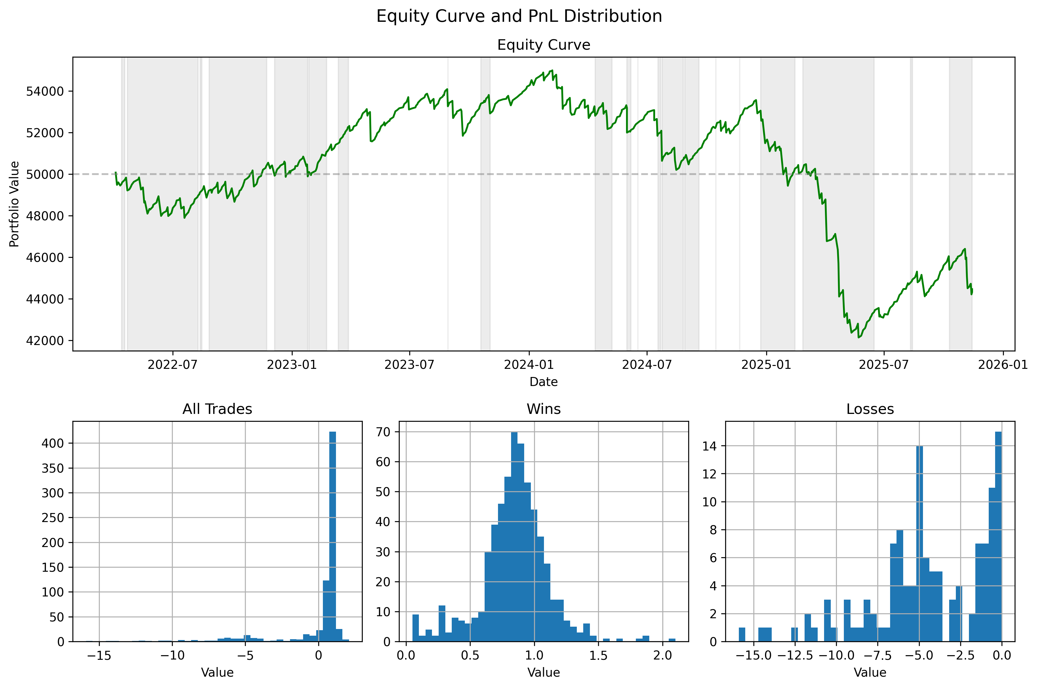 The strategy executed 717 trades with an overall win rate of 82.57%. Despite this high win frequency, the expectancy per trade was −0.078, and the portfolio finished the test period down approximately $5,540 (excluding fees). The summary statistics are reported in Summary Metrics table. The combination of a high win rate and negative expectancy suggests payoff asymmetry. The small, frequent gains were offset by fewer, large losses.