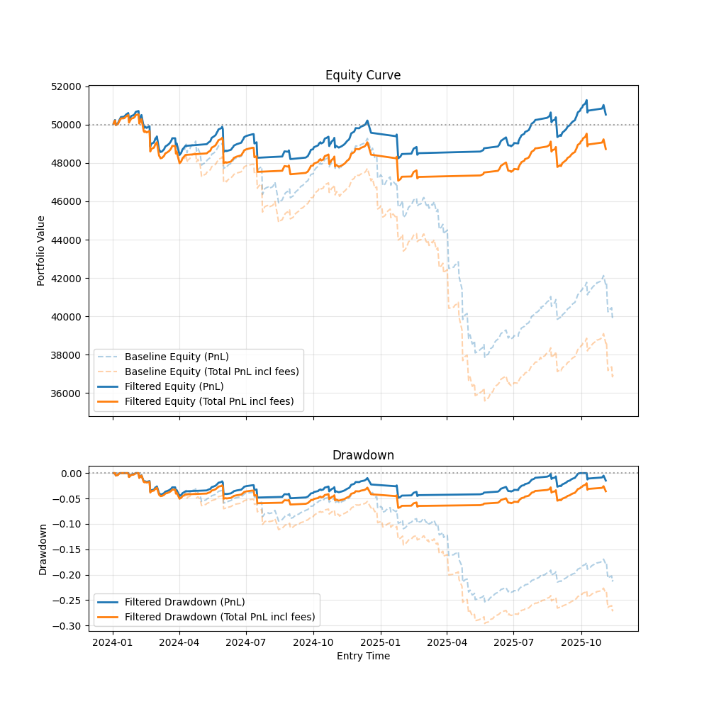 The equity curve becomes noticeably more stable, and the filtered strategy avoids the largest drawdown observed in the baseline, particularly during the sharp volatility expansion in April 2025. Drawdowns are both shallower and shorter in duration. The Sharpe ratio also improves materially even though it remains negative.